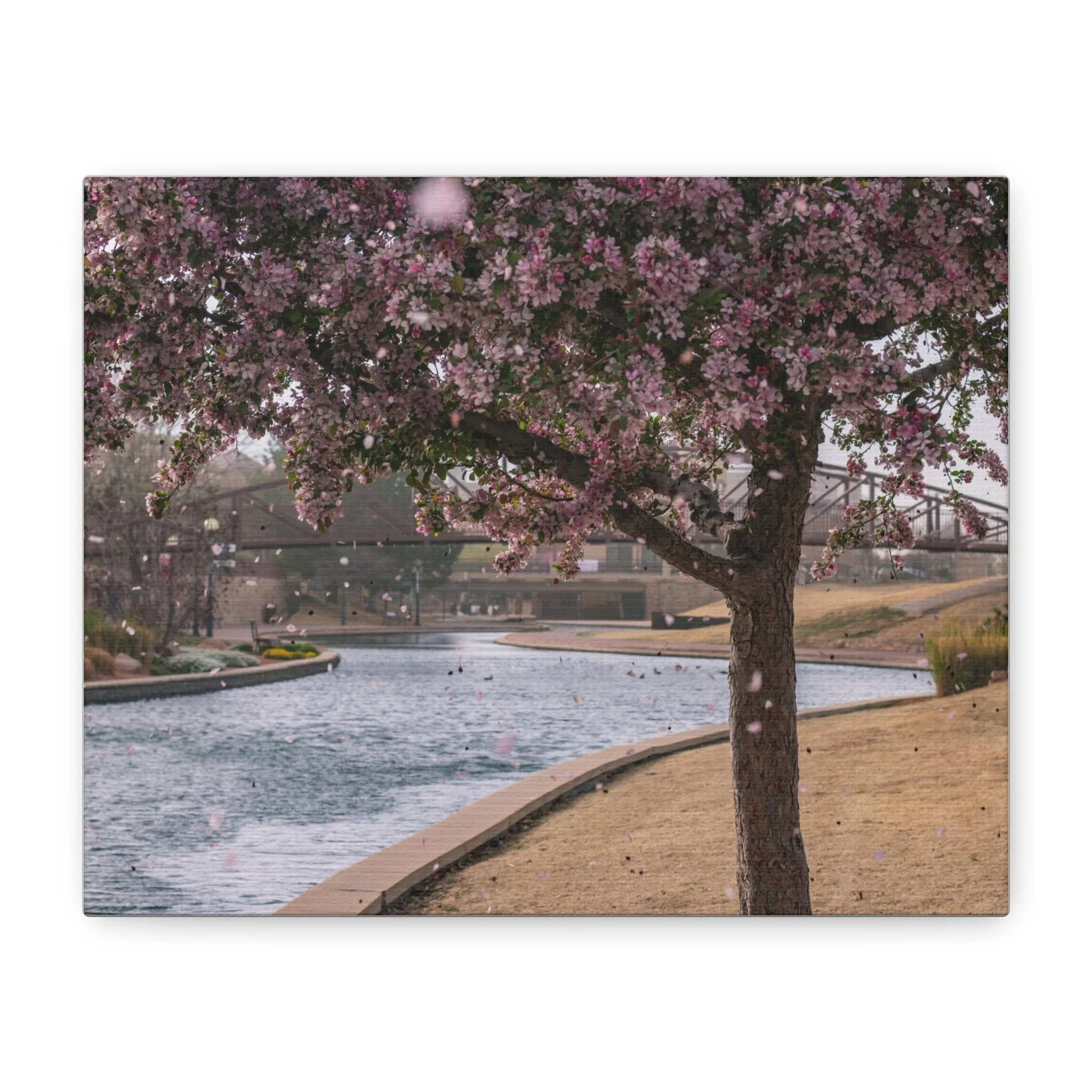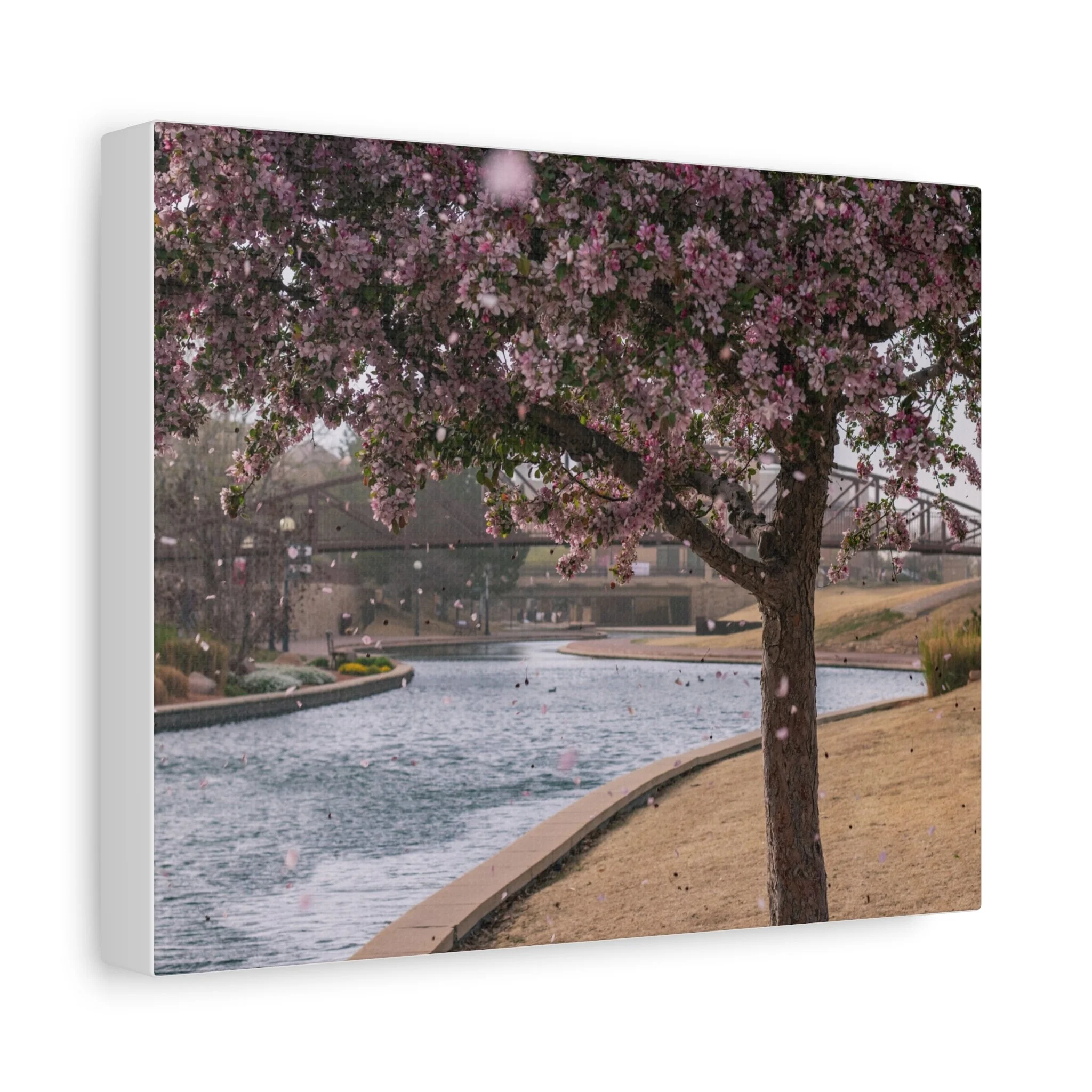 Bring the fleeting, breathtaking beauty of spring into your home or office with this enchanting canvas print. This piece captures a tranquil riverwalk scene, anchored by a magnificent cherry blossom tree in full bloom. Delicate pink petals are caught mid-air, gently drifting down to create a sense of movement and serene calm.